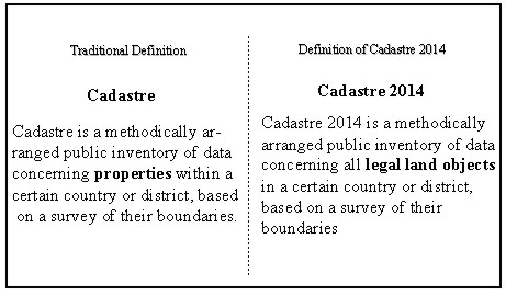Figure 1. Definition of land objects The content of modern cadastres take into consideration all land objects in a defined area. A definition for Cadastre 2014 may be found in figure 2.