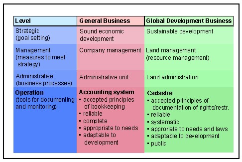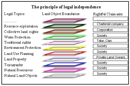 Figure 5. The principle of legal independence The different legal land objects are to be arranged according to the laws by which they are defined. This structure allows the immediate adaptation of the cadastre to the development of the legislation. It is not necessary to rearrange the information when a new law is implemented. New legal topics can be simply added. The second statement on Cadastre 2014 says: The separation between 'maps' and 'registers' will be abolished! The establishment of separate organizations for map production and land registration was often necessary because the two operations used to require different skills, and the available technology did not allow for other solutions. With information technology (IT) it is possible to link land objects directly with the information needed for registration. Land objects can be described in future by the geometric and the alphanumeric parameters, with the latter containing the legally relevant records. The still often practiced separation of the physical and organizational structure will become unnecessary. Statement three takes into consideration that modern information technology based cadastres will have a forceful impact on the way of working: 'Cadastral mapping' will be dead! Long live modelling! Information technology works with digital data and provides the ability to model objects of the real and legal world. Maps as analogue representations will lose their function as information storehouses; their only purpose will be to represent information in such a way that it can be communicated easier and in a more comprehensive form. In future we will have increasingly different graphic representations as extracts of the cadastral model tailored to the needs of the individual customer. To store maps as a picture on a computer is therefore an archaic operation. The fact that in future information technology will be used to operate cadastral systems is expressed by statement four: 'The paper and pencil cadastre' will be gone! As you can see from the terms of reference of the working group, the work concentrated on developed countries because one thought then, that in developing and transitional countries the traditional methods would be carried on. Today, six years later, one cannot find any cadastre project in the world where information technology is not involved. IT makes work easier. The trend to privatize at least the operational work to be executed in the field of cadastre is reflected in statement five: Cadastre 2014 will be highly privatized! Public and private sectors are working closely together! The privatization and new public management topic will affect the cadastre as it affects any other domain of human activity. This is a fundamental trend. The public domain will nevertheless have to provide for secure land titles but it will outsource most operational work and concentrate on supervision. Finally, in statement six the aspect of cost recovery which is also a potent trend is expressed: The cost of Cadastre 2014 will be recoverable! The awareness that even operations executed by the public sector have their price, and that the public and the private sectors have at least to cover their costs leads to efforts to implement cost covering fees also in cadastre. In several cadastral systems it was proved that cost recovery is possible. Because cadastre is a long-term investment the depreciation period for the initial investment costs can be longer than for normal goods. 2. REACTIONS OF THE SURVEYING COMMUNITYThe surveyor's reaction to the brochure was rather positive. A huge interest was shown all over the world. The brochure was translated into further languages such as Albanian, Bulgarian, Finnish, French, Georgian, German, Greek, Korean, Latvian, Macedonian, Polish, Russian, Serbian, Slovenian, Ukrainian. The Australian Institution of Surveyors, asked for the copyright and reprinted 5'000 copies to distribute them to all Australian and New Zealand surveyors. Several universities and other educational institutes have included Cadastre 2014 in their curricula. In several important events, Cadastre 2014 played an important role. Among others, it was taken into consideration during the "International Workshop on Land Tenure and Cadastral Infrastructures For Sustainable Development" in Bathurst, NSW, Australia and the resulting International Seminar in Melbourne in October 1999. Cadastre 2014 was shown there in its future role of a book-keeping system for land management and land administration to support sustainable development. The interest in the vision is still very strong and FIG's Annual Review 99 finds that 'similar best-seller status is predicted for Commission 7's companion publication on reforming the cadastre 'Cadastre 2014''. 3. THE FUTURE ROLE OF CADASTRE 2014 IN SUSTAINABLE DEVELOPMENT OF HUMANKINDThe world, its different cultures, and its political and economic systems are in a permanent development process. This process is driven primarily by the activity and the creativity of humankind. New medical and technical possibilities have impacts on life, on the way of living, and on the way of doing business. One effect of this development is the growth of the world's population. More and more people are to be provided with food and water, housing, household and transport equipment, energy, etc. An increasing number of people are demanding leisure activities and facilities. The demand for waste removal, water cleaning, and recycling materials is increasing. This development leads to an increase in the consumption of natural resources, particularly of land. It has been acknowledged that disorganized consumption of natural resources will lead to a degradation of nature, of the natural world, of the environment, and finally of humankind. Efforts are being made to encourage sustainable development. That means that development should be undertaken in such a way that a minimum of resources are consumed. It is the main 