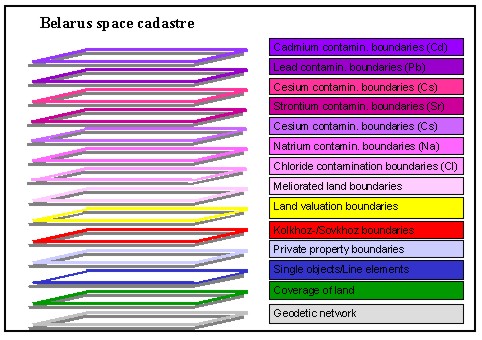 Figure 8. Housing and Property regulation in Kosovo 4.5 The Belarus cadastral systemThe implementation of the private land property in Belarus demanded a new cadastre system. In view of the needs for reliable data on land, in particular in the zones where heavy environmental damages have been caused by the Chernobyl disaster on one hand and by industrial pollution on the other hand, the cadastre was designed to be able to document other land objects than only the private property parcels. Figure 9 shows the structure and contents of the Belarus spatial cadastre.