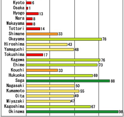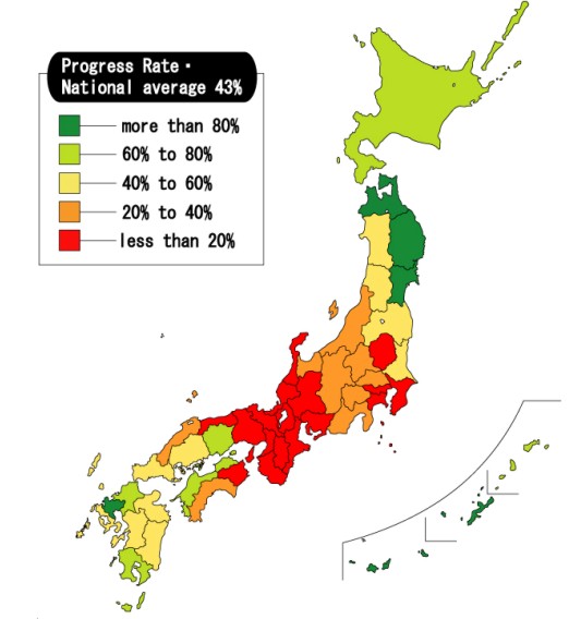 2. PROCEDURE OF CADASTRAL SURVEY(1) Survey Planning (process A, B) The municipality that is conducting the survey makes plans by contacting and adjusting with organs concerned. The municipality has to do the development of an enterprise plan, a public notice of the cadastral survey, the application of a necessary subsidy. The municipality prepares the specifications for their national land survey accordance to the standard specifications established by MILT. Then the municipality official holds a briefing on the survey's substance and necessity for local residents. (2) Basic control point survey The Geographical Survey Institute maintains the 1st to 3rd order control points as the national geodetic control point network. The network is not dense enough for the cadastral survey. The Geographical Survey Institute settles the 4th order basic control point based on the network with the request from municipalities. (3) Geographical control point survey (process C, D) Settle the topographic control point, which is the basic reference of survey. As process C, the triangle survey or the GPS traverse survey is done based on the 4th order basic control points. As process D, the traverse survey mainly using the total station based on the points from process C. Some case, aerial triangulation method is taken to settle these points. (4) The Parcel Investigation (process E) Landowners clarify their own land boundaries for Cadastral Survey. The municipality official in charge visits the actual place referring to data based on an old recorded map etc. The landowners concerning the boundary confirm their land boundaries with mutual agreement. The municipality official also investigates the landowner, parcel number, type of land and so on. Then they put piles along the boundary after the confirmation. The piles display the settled boundaries for each parcel of land. (5) Boundary Survey (process F, G) As process F, surveyors settle the dense topographic control point, and survey to determine the position on earth for each parcel. As process G, after determining the position for each parcel, surveyors make the accurate map (cadastral map) based on each results and measure the dimension. (6) Making Cadastral Record (process H) Integrating results of the Parcel Investigation and Boundary Survey, municipality officials make a draft of cadastral record. The record and map are displayed to the public for 20 days at the municipality. Every person can confirm the results of the cadastral survey. The municipality who has conducted the national land survey may request the president of prefecture to certify the maps and records. The president when he/she has received the request certifies products according to the examination into the products of the national land survey related to the request, unless the products contain a mistake committed in the course of survey in excess for the limit provided for by Cabinet Order. The MLIT obtain in advance the approval of the President. (7) Submit the product of Cadastral Survey to registry office The copies of Cadastral Survey product (the cadastral map and the cadastral record) are submitted to the registry office. The land registry book is revised according to the cadastral record and the old maps are replaced with the new cadastral map officially kept at the registry office. The registry office uses the product of the Cadastral Survey as a material of Immovable Registration in the future. 3. PROGRESS RATE OF CADASTRAL SURVEYCadastral Survey has been conducted since 1951 when National Land Survey Law was established. National Land Survey has been carrying out in accordance with the fourth Ten-Year National Land Survey Plan (fiscal year 1990 to 1999) on the basis of the Act on Special Measures for Promotion of National Land Survey until the end of fiscal year 1999. The progress rate of Cadastral Survey after the fourth plan finished (at the end of fiscal year 1999) stay only 43% of survey-required area and 17% for the urban area. Looking at the progress rate of each prefecture, we can see variation from region to region. Fig. 2 Progress rate