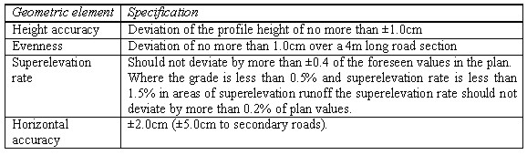 Table 1: Construction specifications of paving operation Conventional methods for staking out and for monitoring the surface geometry of the paved course are demanding, expensive and time consuming procedures. As a result, there is a need for automating the above activities using new methods, instruments and techniques (Psarianos et al. 98). 2. THE USE OF BEARING DIAGRAMThe determination of the road axis geometric elements [radius, clothoide parameter etc] as well as the determination of the location of the starting [ending] points could be carried out using positioning data. These determinations could be realized by two procedures: adjusting statistically the point coordinates to the best theoretical curve, or using the relevant bearing diagram [stationing versus bearing].