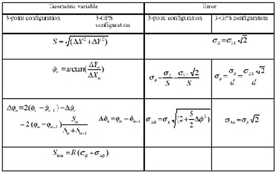 Figure 1: Bearing calculation of a) 3-point configuration, b) 3-GPS configuration The bearing could be calculated using the coordinates of three consecutive points [Figura 1a] (Klumpp 73). This bearing which in case of a curve is along the chord could be considered as parallel to the tangent applied at the middle point of the relevant arc. The exact location of this point on the trajectory requires the determination of the curve radius, which actually coincides with the determination of Δφn. Its calculation is based on three variables - φn, φn-1, Δφn-1 – which requires the use of three consecutive point coordinates. This indirect determination of the bearing leads to an accuracy depending on two types of error: the positioning accuracy of the three points and their distance S - pace of observations [Table 2]. Furthermore, the location of the arc middle point [thus the distance from the start] depends on several parameters and calculated variables. The most important are the pace and the number of points [two inversely influencing variables], as well as the errors of the bearing and the positioning. Collecting data located in very short pace, a large fluctuation of bearings may result. In this way, the calculations of geometric elements are uncertain, since the variance of these measurements is significant compared with the value itself of the bearing change. Thus, for machine guidance moving slowly measurements of points located at least a minimum distance must be used. However, this may result to a lack of the position and orientation of the machine for considerable time period fact that is unlike. The effort to deteriorate the bearing error, decreasing the positioning error and standardizing the distance between the points that calculate the bearing, was the motivation of this research. This has been achieved by performing simultaneous [synchronized] measurements of two distinctive points located on a triangle with sides of standard length. 3. A NEW CONFIGURATION (3-GPS CONFIGURATION)The new configuration consists of a triangle with three GPS receivers. In this way, all three vectors, that is pitch, roll and lead can be followed leading to bearing measurements for course and superelevation rates, while the position of the machine baseline is also continuously available. The determination of bearings may be calculated using Doppler from the code measurements, or direct measurement from the phase rate. The first way appears to be less accurate (baseline measurements with a significant noise), while the second it is not available with the commercial GPS at the present time. A third method used herein uses the coordinates of the 3-GPS points, getting in this way a mean value of two available bearings [the 3d is dependent on the other two]. To satisfy the paving operation specifications DGPS method is appropriate using Real Time Kinematic [RTK] (O' Connor 96) with On The Fly capability (Hatch 91). This technique allows the users to obtain centimeter-level up to five times per second accuracy while stationary or moving [horizontal accuracy of the order 1 - 2cm and vertical accuracy 2 - 4cm while in continuous kinematic mode]. Because these are not adequate for paving, applying a Kalman filtering [i.e. constant velocity model] the provided positioning accuracy could be improved by a factor of 3. This is especially because the dynamics of the whole procedure are extremely low [0.06 - 1km/h] and Kalman filtering acts in fact almost as a least square adjustment. Additionally, regarding cross-slope inclination etc., the relative position of GPS antennae could be obtained with much better accuracy than the absolute position in space of a single antenna, as those three antennas "phase" commonly most of the systematic errors of the GPS system. As a result, the pitch, roll and lead rotations can be obtained with much higher accuracy than the absolute positioning itself. It is expected that the differential phases would be sampled simultaneously removing in this way the variations of time biases. Actually these errors may be of several centimeters (Zimmerman and Cannon 97). After the application of the above described techniques, it was expected that the provided accuracy could be better than 0.5cm horizontally (σ2X) and 1cm vertically. Especially, when the machine moves slowly within road sections of small length (of the order of 4meters), the systematic error does not change more than 1cm for time period between 4 minutes up to 1 hour. In this case, the relevant position between the antennas would be measured with accuracy better than a few millimeters both horizontally and vertically. Obviously, the usual GPS sources of errors may confine the accuracy and the effectiveness of the system; that depend on the availability of fixes, a possible problem when there is obstruction in-between the satellite-receiver sight or other reasons [i.e. other sources of transmission]. Nevertheless, a number of benefits must also be mentioned. First, the fluctuation of pace does not influence the accuracy of the bearing and actually the accuracy of the distance from the start. Second, the very small pace does not influence heavily the determination of path characteristics. Third, although a selection of data may be realized [i.e. data every 1m in the average] for these determinations, there is a continuous position and orientation of the machine. A second configuration consisting of two robotic targets, placed on the machine, and tracked by two non-moving robotic total stations was also investigated. However, the experiment led to immature results, which are not further referred to. Initially, during the first experiments problems of synchronizations appear, which only were overcome in latter efforts. Thus, two different total stations were used with incompatible synchronization and different rates of collecting data. The outcome was that there were completely independent measurements of two arbitrary points 