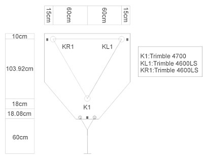 Such a place exists at the top of the paver roof. Whether the 3-GPS configuration is used, the platform must be created of three antennae forming an equilateral triangle, with a distance of 1.20m between every two antennae. This ensures a distance projected on the machine baseline - longitudinal vector length - of 1m (1.039m exactly). This platform has to be firmly connected to the "body" of the machine. Accurate measurements have to be made to connect the position and orientation of this platform with the reference points of the vehicle in order to be possible the interconnection between the external and internal orientation of the machine. By the term internal orientation, is determined the relevant position of different parts of the machine in reference to the GPS antenna.