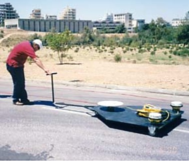 Figure 2: Platform design and image. An additional important problem concerns deviations from the desired path that the vehicle manage to follow due to slippage, difficulty to match the location and orientation of the measured points and the necessary algorithms that must be developed (Zhang and Velisky 94). It constitutes a different component of a robotic machine and therefore escapes from the interest of the present work Within the bounds of this paper, it was assumed that there exists an accurate transfer of observed position and orientation to the machine points in contact to the road surface. Thus, this work focuses on the assessment of the positioning system alone. The experiments were carried out on a target vehicle consisting of a platform traveling on three wheels from iron with no-suspension to ensure that all road anomalies would be described [Figure 2] (Katikas 2000). 5. DESIGN OF EXPERIMENTSThe objective of the experiments was to assess the effectiveness of the 3-GPS configuration and to measure its accuracy in determining the radius of a curved trajectory. The determination was made while the vehicle was considered being in the curve (φ0=0, L0=0). Thus, no assessment in the field on its accuracy in recognizing the transition from one geometric element to the next has been carried out (accuracy of the starting /ending point location). Additionally, a road section with a high curvature was selected (R=54.724m), case where rapid change of bearing occurs but in very short distances. So, while the system is expected to show a high capability to recognize bearing changes, the experiments tested the length within this could be achieved. The target vehicle was pulled on a marked trajectory of a road section consisting of a curve in several cases. These cases served various steps of the investigation. The first step regarded to the assessment of the GPS performance [autonomous system-case 1] compared with a robotic total station [target on the machine and a standing instrument - case 2]. This comparison was carried out using the 3-point traditional technique. At a second step, a sensitivity analysis was conducted to assess the influence of the pace on the radius determination accuracy [selection of points about every 1.5m and 5.0m - case 3a, 3b]. Obviously, pace fluctuation was expected due to irregular time pace observations [loss of targets, or loss of satellites etc] but also because of variations in platform speed. At a third step the 3-GPS configuration was tested [case 4], while the calculations were made elaborating all data. The coordinates of the consecutive points were almost as close as the first two cases. This was decided for experimenting initially with the worse situation but also for comparison reasons with them. Finally, a sensitivity analysis was carried out in order to determine the radius from the first 10% and the 25% of the points [cases 5a,5b]. In this way, the accuracy of the system may be assessed while the radius must be calculated from up-to-current traveled trajectory. The instruments used are the following.