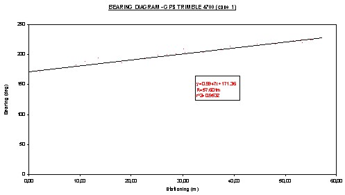 Figure 5: Bearing diagram with one GPS on the platform - case 3a [mean pace 1.5m] A radical improvement was realized when the 3-GPS method was used with a pace approximately of 1.5m [case 4b]. It appears that in terms of radius calculation this case does not varies from the case 3a. Finally, a low percentage of data representing the case of 'up-to-current traveled trajectory' derives problematic values for radius [case 5a,5b]. This means that although the new method provides good estimates for path deviations could not within the first parts of the curve determine the traveled trajectory. This means that a real time repathing strategy could not be defined accurately. However, this is possible after the first 25% part of the curve.