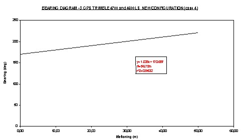 Figure 4: Bearing diagram including all data mean pace: 0.20m Third, although the pace was hold to a very small magnitude, the 3-GPS configuration shows a considerable improvement in calculating the radius [case 4a]. However, in the field this improvement was not fully proven, since the radius value was accepted to represent the real value by its accuracy is hold low. Contrary, the regression coefficient shows an excellent correlation, which indicates the high capability of the method to recognize the circular path. This results to accurate estimation of the stationing of various points (when the radius is known from the CAD), and further an accurate estimation of the ending point of the curve. Additionally, the sensitivity of recognizing a path deviation is high (Smin=1.6m), and most important being independent of the mean pace of observations.