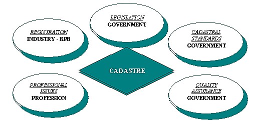 Figure 1: Proposed Regulatory Roles and Responsibilities and the Cadastre (Source: Bell, 2000) 7.1 Role of GovernmentThe primary role of Government will be to focus on the setting of policy and standards in order to protect the cadastre. The Surveyor General's role as the principal administrator of land surveying is to develop policy for the active development and maintenance of the cadastral surveying infrastructure. The Reform of Land Surveying Project aims to establish future quality management procedures for surveys that 'change the cadastre', rather than relying solely on the Government regulation of surveyors, as is now the case. Government will set necessary standards and guidelines, and quality assure the inputs to the cadastre and the geodetic infrastructure. The crucial roles and responsibilities of Government within the preferred model include: