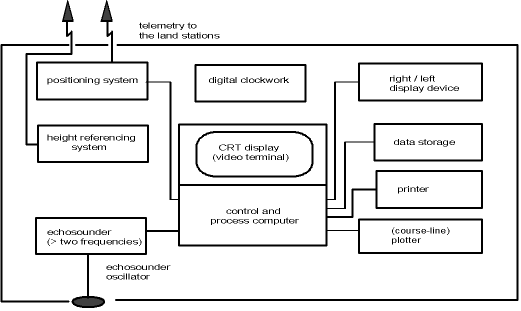 The sensors are normally: the positioning board system, inclusive an antenna or prism circle outside the steering house, the echosounder system, inclusive the acoustic oscillator (transducer) and the height referencing system, cf. figure 2. If needing highest accuracy, it is necessary to have a motion sensor (for heave, roll, pitch) and a gyro compass for the stability of the surveying vessel (as the platform for all sensors) in the short moment of measurement during practical work. If you will not work with tide gauges, when working in near distances (until 500 m) to the boarders of the river, so-called niveaulaser systems are in use (Behrens 1993). Another way of work is to use the vertical angle of polar-fixing systems or nowadays the use of satellite positioning systems.