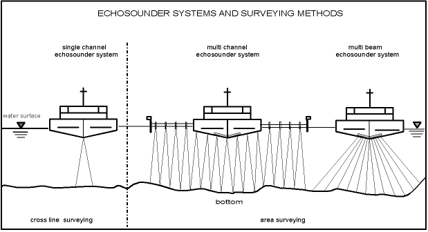 Figure 3: Principles of echosounder systems for cross line and area surveying All three main groups of echosounder systems: single and multi channel and multi beam echosounder system are in use today for getting surveying profiles or a complete information (depths, topology and morphology) of the whole river or canals body, the coastal bottom as well as the water areas of harbours, cf. figure 3 (Behrens 1999b). I think we take and had been taken that special echosounder system, which is and had been demanded by each different user of surveying information. Now I will give You some experiences with the two novel systems: electro-acoustic "peilrahmen" - a high precise multi channel echosounder system - and multi beam echosounder system for use on Federal Waterways in FRG. In 1996 the BfG had become order to made researches on multi beam echosounder systems for use in shallow waters. We had got an overview after looking at the international market, especially the firms: L3-Communications Honeywell Elac, Reson, Simrad and STN Atlas Elektronik. The staff-members of "Geodesy"-BfG made together with members of WSA Duisburg-Rhine a lot of trials with the Simrad EM 3000 system of about 4 weeks in the Lower Rhine Region near by Duisburg in 1997. The handling with the system, the installation on board and the resulting accuracies in the Rhine river as well as the recognition of underwater buildings, of locks and of obstacles had been the main aspects during the tests (Wirth, Böth 1997). Here are some results of the tests with Simrad EM 3000. The multi beam echosounder system data can be used until 8 times the water depth, e.g. 8 x 3 m = 24 m is the width of the surveying lane on the bottom. The accuracy is about s = 10 cm (P = 95 % confidence level) under mentioned conditions. The accuracy of the vessel stability itself to a fixed position is on average 11 cm under a measurement velocity of 2 m / s. A large multi channel echosounder system have 40 m width, but the extend metallic construction needs a big vessel and demands for a very good steering by helmsman. So it is easier to use multi beam echosounder system, although you need twice lanes for surveying the same bottom area. In 1997 the BfG together with the WSA Regensburg (Danube) made researches on a new constructed electro-acoustic "peilrahmen". It has 33 transducers (3 per 1 m of length) for vertical sounding installed in a row on a metallic mounting. This construction is a mobile one and can be changed from one surveying vessel / boat to another. The manufacturer is Dr. Fahrentholz from Germany (Kiel). The electro-acoustic "peilrahmen" has the best use for finding small obstacles on the river bottom, because the sounding signal rate is 40 times / s (= 40 Hz). There is exactly the same accuracy as with multi beam echosounder system, but the costs are cheaper and the surveying lane on the bottom is 11 m. As a conclusion out of the testing results, it is necessary to reduce the digital data for both echosounder sytems. The data density must be reduced in that way, so that after computing and data plausibility the whole bottom area is characterized by single but essential points of obstacles (Wirth 1999). I think for that aspect and for handling the huge mass storage of data, an enormous task is to do in future for all hydrographers! After ending the both tests described above with reports (Wirth, Böth 1997, Böth 1998), the BfG developed a long list on the performance characteristics which must be necessary, if one WSA will buy a multi beam echosounder system. It was worth to do that for such kind of complex system! It was very difficult to get all information from the firms, because some parts or modules of the systems had to be develop in future and some descriptions are not so quite specified for the user. Today there are 6 multi beam echosounder systems in use on the Federal Waterways in FRG and 4 systems are purposed for the next two years. 2.5 Special Measuring MethodsIn the surveying of the beds of water bodies, one distinguishes between the measurement of longitudinal and cross profiles and the area measurement. The choice of the surveying method depends on the availability of instruments, the type of ship and the surveying equipment on board for "peilungen". Multi-purpose measurements are given preference to supply several users with data (choice of the most economical method) in sufficient accuracy for fields like navigational safety, dredging, hydrology, planning and implementing works in hydraulic engineering. In coastal waters, and partially also in tidal rivers, the distance between the sounding lines varies between 50 m (in the demarcated navigation channels) and 400 m (over tidal flats). The presently used system operates with single oscillator echo-sounders (e.g. 100 kHz), often supplemented by oscillators for a second, lower frequency (e.g. 15 kHz) for distinguishing silt and sediments. Today for that special surveying there are special instruments in use with developments in future (Wendt 1999, Eden 1999). Of course, priority is given to navigation channels against the other areas in the regular updating of surveys. The results of the surveys are available to users in form of digital data (WSV-point file), as representations of cross sections or depth charts, depth contour charts, and the Maps of Federal Waterways in large scale (e.g. 1:2,000). These maps are produced and regularly updated in the mapping departments of the WSV or ordered from private firms. I just want to mention that the digitalized Map of Federal Waterways in the scale 1:2,000, which shall also be the basis for a future information system on waterways, is in the process of preparation. 3 FACIT, FUTURE ASPECTSThere is on the one side the development of the components and of the whole surveying system for "peilungen". On the other side there is the interest of people outside the Federal Waterways and Shipping Administration (WSV), who want to buy the data 