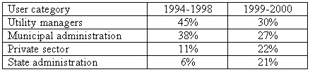 As can be seen on Pic.3, it is obvious how the interest of individual groups for CDMP outputs progressed. Up until 1994, users could have the outputs from UDMP only. At that time, 14% of the Prague area was completed. The interest was outweighed from the side of utility managers and the municipal administration. In the period 1995-1998, interest rapidly increased due to the finished DRM, DORT (since 1997) and UDMP (completed for 64% of the Prague area). As in the previous period, the most significant users were the utility managers, who started to build their own information systems. In addition to these activities, the data delivery to the municipal offices increased (Prague has 57 municipal parts). In 1993, 15 municipal offices used the CDMP data. In 1996, however, the number rose to 45 and presently 56 municipal offices use the data. The interest from the side of state administration and universities was significantly influenced by the combination of the UDMP and DORT. The main customers are financial offices, the Ministry of Finance, the Ministry for Regional Development, the Czech Office of Geodesy and Cadastre, the Czech Statistical Office and the Office of the Czech President. From the universities, the users are mainly the Faculty of Architecture and the Faculty of Civil Engineering of the Czech Technical University in Prague. The interest in the private sector increased slightly, but since 1996 it represents the highest growth. Finally, the private companies could afford the appropriate HW and SW equipment. It is quite interesting to compare the relative shares of the user groups in the total data amount: