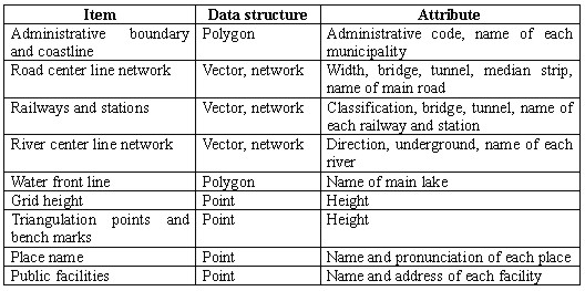 These data sets have been published from April 1997 for the use of unspecified individuals at an appropriate price, just as the Digital Map Series. They are also distributed free of charge to every local government that provided data sources. The whole planned area was covered in March 2001. 5.2. SDF25000Table 3 indicates the content of SDF25000. Table 3. Contents of the Spatial Data Framework 25000