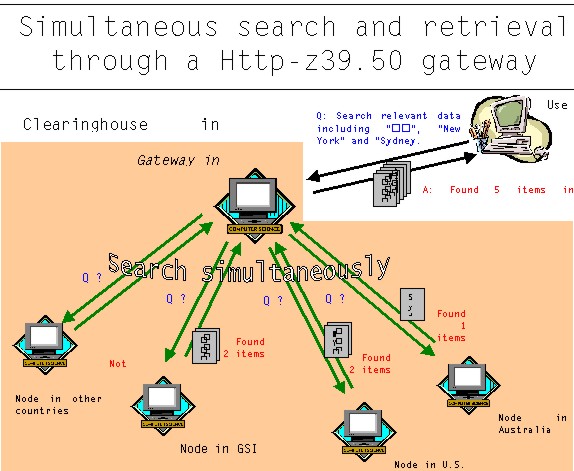Data development started in 2000 and is expected to complete in 2002. SDF25000 covers whole area of Japan and will be published from October of 2001. 6. STANDARDIZATION OF GIS DATA6.1. International standardInternational organization for standardization (ISO) started established Technical Committee for GIS standard(TC211) in 1994. TC211 has been continuing discussion on this issue. Japan participated in ISO/TC211 from the beginning of this activity and contributed to the development of standards. The ninth plenary meeting was held in Kyoto on September 1999, and the twelfth plenary will be held in Lisbon on March 2001. 6.2. National Standard of JapanBased on the need to develop a GIS standard for Japan, which is in accordance with that of ISO/TC211, GSI started research on Japan's GIS standard in 1996. This research was also intended to provide a technical backbone for the Japanese SDI standard discussed by the Liaison Committee of the Government. Fifty-three private companies joined this three-year research project funded by the Ministry of Construction as one of the projects of the collaborative research program with the private sector. Two kinds of standards were developed through this research: spatial data exchange standard and spatial data development standard. Six working groups were established for the exchange standard to discuss 8 work items including data structure, data quality, georeferencing, metadata, and cataloguing. Spatial data development standard includes a guideline to develop specifications for spatial data development contracts. The final draft of the standard was developed at the end of FY 1998 and adopted as part of the NSDI Standards by the Government Liaison Committee. After completion of the final draft in FY 1998, GSI and thirty three private companies entered into the second stage of this research activity. The goal of second stage is to refine the draft produced in FY 1998 and make it available in practical use. The guideline for a product specification of GIS data is also being developed in this second stage. 7. OTHER ACTIVITIES OF THE GEOGRAPHICAL SURVEY INSTITUTE7.1. Research on Development of Geographic Information Directory Database (GIDD)The Long-term Plan developed by the Government pointed out the necessity for National Spatial Data Infrastructure and specifies the need to establish a clearinghouse system for spatial data. GSI has been developing a Geographic Information Directory Database (GIDD) as a five-year research project since April 1994. This database is designed to provide directory information (i.e., metadata) of spatial data through computer networks, and to become a clearinghouse node by developing a search environment of distributed databases. The metadata standard, which is currently used in the GIDD, is developed as one of the work items of the Spatial Data Exchange Standard of "Research on GIS Standardization" described above. This standard can be considered as the Japanese localization of ISO/TC211 15046-15115 Metadata by making modifications on, for example, spatial reference, addressing, and language (i.e., Japanese). A prototype of GIDD with limited search capability is now in the process of practical testing. This prototype provides 229 records, experimental metadata of Digital Map 10000 (Total) in Japan. GIDD has the ability to make a query using 12 attributes such as title, keyword, longitude, latitude, and producer as well as a combination of these attributes using logical operators. Retrieval result will be shown in a list of URL and we can retrieve metadata through WWW. The URL of GIDD is http://giddsurv.gsi-mc.go.jp/gidd/. Based on the result of these tests, we will enhance its search capability and support distributed environment. 7.2. 3D GIS Study with AUSLIG and the University of AdelaideThis cooperative research, started in 1997, has two main purposes. One is to develop a precise three dimensional measurement system of urban features using an airborne laser. Compared with conventional photogrammetric methods, this system enables us to acquire 3D data with high spatial and temporal accuracy. GSI mainly takes charge of this study. The other, mainly pursued by the Australian side, is to develop an interactive 3D GIS model for urban planning. A prototype has been already created. This study aims to improve the user interface by embedding data and scientific models within the current 3D GIS environment to allow creation and then verification of urban planning scenarios in real time. 7.3 Clearing HouseA Clearing House is one of important tool for finding and using of geographic data. In Japan several organizations are developing their clearing house. GSI has developed its clearing house and opened it March 2000. The clearing house adopts Z39.50, so we can retrieve geographic data from sites located in many countries through this clearing house. The concept of this function is illustrated in Figure 1(next page). 8. CONCLUSIONDevelopment of geographic information infrastructure cannot be achieved without collaborative efforts by all the worldwide organizations and individuals concerned. We hope our experiences might be helpful for the development of geographic information infrastructure of other countries.