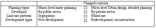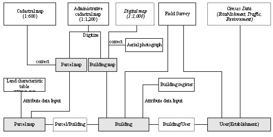 Table 1. The shift of urban planning paradigm The chapter 7 of the Agenda 21 which is adopted at RIO environment and development conference in 1992 suggests the program for the promoting sustainable human settlement development as follows: (1) providing adequate shelter for all, (2) improving human settlement management, (3) promoting sustainable land-use planning and management, etc. To implement these programs, the following means are suggested: (1) improving urban management, (2) strengthening urban data systems, (3) undertaking a comprehensive national inventory of their land resources, (4) accessing to modern techniques of land-resource management, such as geographical information systems, satellite photography/imagery and other remote-sensing technologies. The above means have little attention to the inner area's sustainability and the relationship and the impact among the components (such as people, establishment, land use, etc). The purpose of this study is the development of Extended Urban Land Information System (EULIS) that can manage the highly developed inner urban area sustainable by extension of Urban Land Use Information System model (Koh, 1995). 1.2 The study methodThe area of this study is focussed on the highly, densely and vertically developed urban area. The data for this kind of study will come from:
