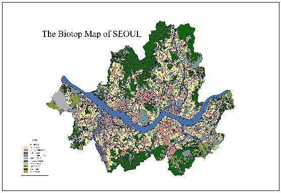 The Rio declaration on Environment and Development in 1992 proclaims the principles. Principle 3 that contains the concept of sustain development is "the right to development must be fulfilled so as to equitably meet developmental and environmental needs of present and future generations". The indicators for the measuring the achievement of sustainability in the United States, that is recommended by the president's Council on Sustainable Development, have to include the economic propensity, environmental health, social equity and welfare. Kim, et al. (1997) suggest the sustainable urban development strategies as follows: (1) to plan more park and green space in the city, (2) to improve pedestrian space and network, (3) to make a city culturally richer place, (4) to reduce the traffic demand, (5) to build the urban information system, etc. The land cover and Biotop survey using the GIS and remote sensing technique is conducted by Seoul Metropolitan Government (SMG) recently. The Biotop survey data will be very useful for the sustainable urban planning and management, urban ecosystem conservation and restoration, etc. SMG will periodically produce the Biotop map that shows the current ecological status of Seoul. Below figure is the Seoul's Biotop Map (from http://green.metro.seoul.kr/). These kinds of study and survey are using the more area-wide land use information. So, they are more appropriate for the macro-level and 2-dimensional analysis. But, the future city will be more compact, high-rise and will have higher density structure than now. Such city's sustainable development and management will be possible by the continuous monitoring of urban infrastructure's carrying capacity. By the construction of EULIS that contains parcel, building and user's traffic and environmental characteristics, the sustainable, micro-level, scientific and efficient urban management will be possible.