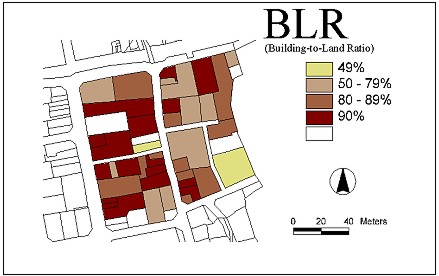 The FAR which implies the density of urban development can be calculated and shown with this system. <Fig. 1> is the flowchart for BLR and FAR. <Fig. 2> and <Fig. 2> are the result maps of BLR and FAR each. Those information can be utilized in the designation of redevelopment area and detailed area planning (such as Germany's B-planning).