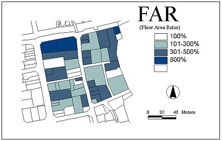 Fig. 3. The FAR Map This kind of Urban Land Use Information System model that is using the SIC (Standard Industrial Classification) code of establishment can provide more accurate and scientific land use information than the existing land use information acquisition system using land register's land type or building register's building usage type data. This model is more useful than traditional methods in the understanding of land use patterns for densely developed urban area such as CBD. But, It has some limits such as follows: