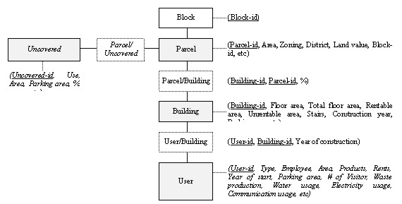 According to the issues of the agenda of Habitat II conference that held in Istanbul in 1996, the necessity of construction of LIS for the more integrated and better land management is emphasized. And the existing urban infrastructure has to be fully utilized and the development has to maintain the proper density according to the carrying capacity of facilities. At the same time, the International Federation of Surveyors (FIG), particularly Commission 7 that is responsible for cadastre and land management published "Statement on the Cadastre" in 1994. Among the roles of cadastre, the sustainable development and environmental protection are stressed. "A Cadastre is normally a parcel based, and up-to-date land information system containing a record of interests in land (e.g. rights, restrictions and responsibilities). It usually includes a geometric description of land parcels linked to other records describing the nature of the interests, the ownership or control of those interests, and often the value of the parcel and its improvements. It may be established for fiscal purposes (e.g. valuation and equitable taxation), legal purposes (conveyancing), to assist in the management of land and land use (e.g. for planning and other administrative purposes), and enables sustainable development and environmental protection." The theme of the conference sponsored by ISSS and ITC is "Geoinformation for Sustainable Land Management". The concept of Sustainable Land Management (SLM), the construction of Geo-Information Infrastructure (GII) for SLM, etc. were dealt. In Korea, the government and the research institutes have been attended the development of Land Information System development since mid 1980s. As one of the administrative information system of government, the land register was computerized in the late 1980s. Korea Research Institute for Human Settlements (KRIHS, 1985) had a research about the Urban Information Management System. The researches and developments on Land-related information system as the National Information Infrastructure (NII) have been accomplished such as follows: (1) Ministry of Home Affairs (MOHA, 1993) and Korea Computerization Agency's research on the development of Parcel-based Land Information System (PBLIS), (2) Ministry of Construction and Transportation (MOCT, 1995)'s National Geographic Information System (NGIS) project, (3) Seoul Development Institute (SDI, 1996)'s research on the development of Land Use Information System (LUIS) for Seoul, etc. 3. THE ANALYSIS OF THE EXISTING URBAN LAND USE INFORMATION SYSTEM (ULUIS) MODEL3.1 The characteristics of urban land useThe users, such as people and establishments, bring on the urban land use. The land use gives rise to the urban infrastructure's foundation. The land use that is represented by the urban activity has the close relationship with the infrastructure. The appropriate combination between the activity and the infrastructure will make the city more pleasant and safer to the peoples. The types of the activity in the future will be more diversified than before. It will gradually arouse the mixed land use patterns. By the Procos (1976), the multi-purpose and mixed use of parcels and buildings considered as not changing within a certain period of time. That is, the industrial area that is developing to the residential use is considered as industrial use. But, the purpose of large-scale comprehensive developments is the round-the-clock use of the buildings. So, in the measuring the changes of land use, the time variable has to be considered. 3.2 The analysis of Existing ULUIS ModelThe study on the development of Urban Land Use Information System (ULUIS) Model (Koh, 1995) is focused on the urban land use, especially detailed and vertically differentiated land use. The vertical expansion of great cities makes impossible to understand the land use pattern with the aerial photograph and remote sensing data only. 3.2.1 The data collection system The data collection system of the ULUIS Model is as follows: (1) the digitizing of the building's footprints from the aerial map (1:1,200 scale) and the parcel boundary from cadastral map, (2) the input of attribute data, such as address, area, land value and owner from land register, use, year of built, number of stairs from building register, classification by industry, total floor area and number of employees from establishment register, (3) the field survey for parking lot, open space, etc. The digitalized attribute data has to be opened to the public and fully utilized for the maintenance of ULUIS database. It will reduce to cost for the construction of the database. 3.2.2 The entities of ULUIS database The ULUIS Model is based on the relational database. After the conceptual model is built, the E-R model is fully normalized for the perfect retrieval and the no duplication. The entities of this model are parcel, building and establishment. 3.2.3 The usefulness and limits of ULUIS model The usefulness of Urban Land Use Information System is as follows: