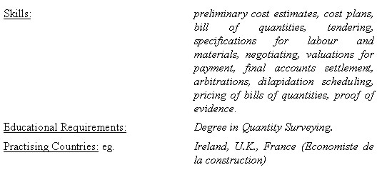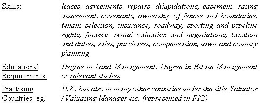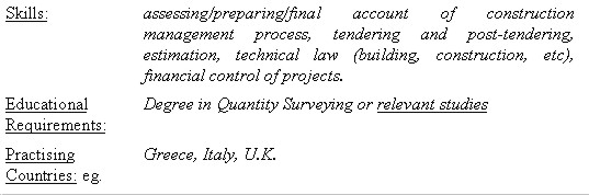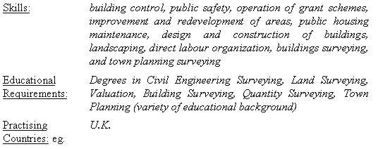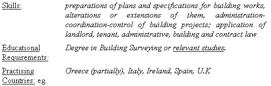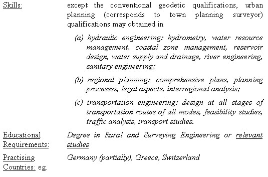 Impact of new technologies Surveying has relied from its origins on measurements (data gathering) and data interpretation, data managing and manipulation (modelling), i.e. KENNIE 1998. For centuries surveyors have been essential for correct and accurate data gathering and modelling. However technological evolutions in the last twenty years of the twentieth century have dramatically changed the data gathering and modelling process in a way that surveying qualifications are easily attained. Consequently market needs have been transferred from the BAC+3 or higher qualifications standard, to the technician level standards. This applies to both the public and the private sectors. This is clearly reflected in the declining number of students attending university surveying courses in many countries, as well as the patterns of hiring surveying personnel by technical firms and public offices. In Germany for example an increase of 11.5% of surveying technicians between the years 1984 and 1995 in the public sector has been recorded, while qualified surveying engineers have been reduced by 10.6% in the same period. This trend will continue in the years to come and it is expected that the ratio between newly qualified surveying personnel qualified to BAC+4.5 to newly qualified technicians, will for the first time be around 1:7 each year (SCHROEDER, 1998). The surveying profession itself Although all professions are undergoing development processes for various reasons, one can hardly find a technical profession that compares with the surveying profession in terms of its variation, diversification, split, and its undefined or untrained professional sectors. The FIG definition of Surveyor is by no means complete and all-inclusive. It needs to be adapted to reflect the profession's full coverage of branches and activities as practised in, and recognised or accepted by the market globally. In a world where globalisation seems to be the driving force of economical development, surveyors must depart from local and biased definitions of their professional boundaries, and be fully aware of their opportunities in a world market. A complete understanding of what surveyors are and what role they play or can play in a very competitive free world market, is a prerequisite of re-establishing an attractive professional field. Surveyors in one part of the world learning from the opportunities that surveyors from other parts of the world have developed, may help them overcome either reduction of the demanded qualification standards, or the shrinkage of professional prosperity and image experienced locally. The often expressed aim and task of the modern surveyor is to go beyond the profile of professional being solely a "data supplier" or "data administrator" (MAGEL, 1999) and achieve the profile of a professional with "integrated competence" in land, property and construction management. As envisioned by FIG (KENNIE, 1998) this demands the synergetic effort of education, professional organizations and institutions on a national and international level in the years to come. Non-geodetic surveying activities is a professional domain, where surveyors have succeeded in becoming successful professionals with high level qualifications. Standards are verified by wide acceptance at a national and international level by that most objective and final accreditation body, the free market. By doing so, non-geodetic surveyors have managed to overcome the burdens from which the profession is currently suffering. Non-geodetic surveyors have indeed "broadened the scope of our activities" in the words of the current FIG President R. W. Foster (FOSTER, 1999) and have paved the way for the successful market entry by highly qualified, highly respected surveying professionals. The area covered by non-geodetic activities is not well known even by the surveying society worldwide. Unfortunately many of the fields of the non-geodetic activities are not included and not represented within FIG itself. This is one main reason for ignoring the extension the whole surveying profession has attained in the past years. In the following an effort will be made to describe these activities to a wide extent, but with no claim of completeness. It will especially focus on surveying non-geodetic activities mostly unknown to the vast majority of the surveying society! 3. A GENERAL OVERVIEW OF NON-GEODETIC ACTIVITIES NOT REPRESENTED IN FIGNon-geodetic activities cover a wide range of activities and require a specific educational background, occasionally not provided by conventional surveying or geomatics curricula. Since qualifications are acquired frequently outside the conventional path of a geodetic surveyor, specific professional organisations or institutions other than the geodetic institutions provide accreditation or licensing for practicing such activities. Some of the non-geodetic activities of surveyors are represented within the existing commissions of FIG and therefore may be assumed to be adequately known to the surveying community, i.e. urban planning, valuation, land management, etc. In the list, that follows an effort has been made to describe in brief the most common non-geodetic activities, which are either not represented or are under-represented in FIG, including the specific educational and / or qualification requirements associated with them. Furthermore due to the variety and the number of non-geodetic activities of surveyors not represented in FIG, it is not possible to present here a complete list and description of them. Therefore the description is restricted to those non-geodetic activities that are associated with a protected or unprotected Title. It should be stressed that non-geodetic activities are carried out either under an individual profile of surveying, carrying a corresponding name, i.e. quantity surveyor, or they are supplemental qualifications acquired usually in parallel to conventional surveying qualifications from a u