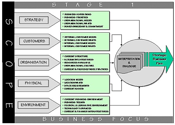 Figure 1. SCOPE Parameters The SCOPE model (Figure 2) allows a dual focus which in turn providers the arena to determine the key factors that will set the template for consideration for coalface facilities planning. The model was applied to current NHS provision within the Royal County of Berkshire in the UK. The application would be undertaken in two specific provision areas, namely local general practice facilities for a particular urban centre and secondly hospital services across the county as a whole. With this information 'Stage 1' of the SCOPE model would be applied to these two provision areas. From this information the research could be further developed to identify the practical steps needed to adapt and rationalise the current facilities to meet the revised business strategy. The planning process could then follow a process similar to that proposed by Then (1996) who identified Strategic Facilities Briefs and Service Level Briefs in the context of strategic and operational management. This would correspond to the second stage of the proposed model.