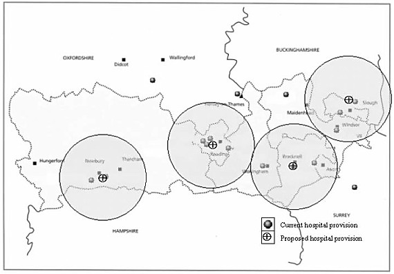 4. INTERPRETATION & DIALOGUEThe initial research undertaken did not show a clear strategy for implementation had been thought through at this time. The paper therefore sets out its own interpretation based on the analysis completed to date within the context of the proposed model. From the completion of the models Stage 1 a framework of healthcare provision can be proposed in an idealistic form which can provide clear parameters based on population density and distribution together with an understanding of customer wants and environment changes and forces. A survey was undertaken in January 2000 by the local Healthcare Forum, which comprises of local authority and local/county wide healthcare representatives. The aim of the study was to identify healthcare patterns within the local population of 101,000 to determine the users perception of their healthcare needs and wants. A questionnaire was sent to 43,500 homes of which 14,408 were returned, approximately one third. The questionnaire asked residents about their use of hospital based services and community based health services together with views on ease of travel and what services they would want to be provided more locally. The results were published (Bracknell Forest Health Panel Forum 2000) and showed that 55% of the respondents within the last twelve months visited the hospital within 15km of the town centre while 23.5% visited the hospital with a 25km radius compared with 21.5% who visited the hospital within 20km. Interestingly a large hospital within 22km was not identified as being visited. A large majority of the respondents (83.5%) identified that the nearest hospital (15km radius) was 'very' or 'quite' easy to access. One in eight (16.5%) travelled by public transport with the remainder using their own transport either as the driver or as a passenger. The survey identified that the greatest use of health services was the family doctor with 91.9% of respondents having used these service within the last twelve months. The survey further identified the healthcare 'wants' of the local community, which showed that nearly two-thirds stated they would like a more locally based Accident & Emergency (A&E) facility, one third mentioned the provision of a minor injuries unit and just under one third identified an out-patients clinic as being an important local service. The hospital based within 15km of the town center provides all the services identified by the respondents as being important. The survey data helps identifies the services that healthcare users perceive as important in terms of local provision together with an indication albeit by default of the acceptable travel distances for such services to provided within. Application of the Scope Model to this case study highlights the importance of the two-stage approach with the business focus leading the strategy. Stage one of the model incorporates the needs and views of 'purchasers' together with an analysis of physical assets and environment changes which in this case include Governmental moves to increase primary care with more and more services being centered around the family doctor. From this standpoint only can you then proceed to consider the strategy relating to the physical asset. A simple outcome of this case study when applied to the SCOPE Model could see the resultant facilities strategy. Currently there are 14 doctors practices serving the local healthcare economy under review, the research proposes a criteria that one practice should serve a population within a 4km radius with locations centralised within current or proposed transport infrastructures. By mapping locations based on this principle (see figure 3) it can be identified that the current provision of 14 practices can be reduced to 9. Areas of reduced population density would be served by practices with a greater circle of coverage say 8 - 16km mile radius. A 'walk-in centre' providing non-appointment services rather than being a dedicated doctors practice could serve the centre of the town. Simplistic although this process has been it has identified that purely setting a strategy based on facilities does not produce a cohesive business/customer led focus. The exact diameter of service coverage is not particularly relevant more that a framework has been applied which allows a qualitative analysis of service needs and strategic application based on the analysis interpreted under the SCOPE model. A similar exercise was applied to hospital provision applying a 15km radius based on the surveys findings that such a distance was acceptable in principle in locations with high population densities. Where densities are more wide spread e.g. for rural areas, catchment areas for hospital would have to be wider. This was plotted on the existing service provision map (see figure 4) and showed that current allocation of 17 hospitals could be reduced to 4. Naturally the original number of hospitals provided services for elderly and this may need to be added to local provision, as large travel distances may not be appropriate for such users. Areas with low population density could be served by mobile satellite services coming from the main hospitals linking with the increased services identified earlier that could be provided at the practice end allowing communication links with the hospitals reducing the needs for visits.