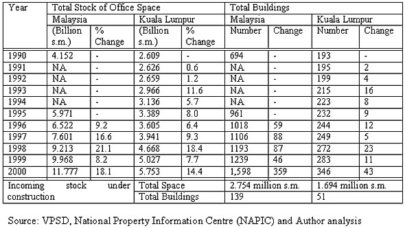 From bank lending aspect, bank loans to the broad property sector including construction by commercial banks and finance companies have generally increased from RM32.6 billion in 1990 to RM127.6 billion in 2000. These economic indicators portray an expanding and growth oriented economy, which should give rise to employment, greater spatial requirements for manufacturing and production industries, service industries, as well as office and retail space and housing accommodation. Accordingly the numbers of operational property assets such as offices, industrial premises, shopping complexes, and residential and agricultural buildings have increased tremendously. In office sector, over the last decade the number of purpose-built office buildings have increased from 694 in 1990 to more than double i.e. 1,598 units in 2000 (VPSD, 2000). It can be gleaned from Table 2 that the current supply of purpose built office space is 11.77 billion square meters compared to 4.15 billion square meters ten years ago. Almost 50% or 5.75 billion square meters of this space is located in Kuala Lumpur, the capital city of Malaysia and the development of Putrajaya as the administrative city for Malaysian central government contributes 333,000 square metres of office space from 21 buildings. In the last five years office property market experiences annual increase in office space of more than 8.2%. More than 2.75 million square meters of office space from 139 buildings are expected to come into market in the next three years. Thus there is an enormous amount of office space, which has a tremendous amount of asset value in property market. These properties need to be effectively and efficiently managed, as there is significant relationship between property management and investment performance. Effective property management may reduce operating costs, dispose of excess properties, or hold on troubled properties by improving their operating income (and reducing their operating losses). Table 2. Purpose Built Office Space (1990 - 2000)