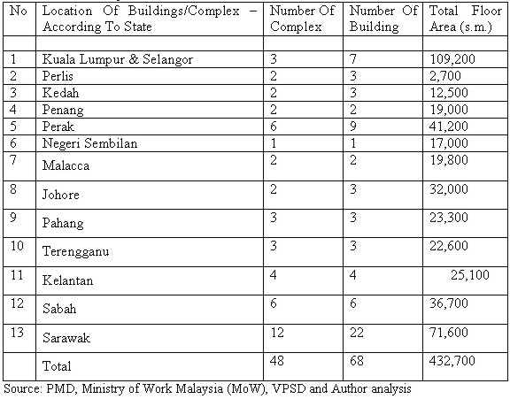 Figure 1: Management Organisation In Public Sector Property Management In the case of common central government office buildings PMD holds the overall responsibilities on the property management aspect while the other agencies act on advisory capacity. Table 3 below shows that PMD manages 68 common central government office buildings throughout the country, which contributes close to half a million square meters of office space. At the same time PMD also has 12 projects for construction of similar buildings that are either at planning or construction stage. Table 3. Common Central Government Public Office Buildings Managed By PMD Of Prime Minister Department