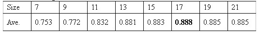 As shown in Table 1, RMSE of images with 70mm focal length is less than the case of 35mm, and the additional bundle adjustment gives higher accuracy than the bundle adjustment. So, in this case, we just used digital images of the reference stone acquired by the 70mm focal length digital camera. 3.3 Auto MatchingAuto matching for the acquisition of object space coordinates is commonly used in area-based matching method using the maximum correlation coefficient, which is computed based on the cross-correlation function, and this method was used in this paper. Also, pre-processing of auto matching where the matching size should be determined. Thus, in the determination of matching size, after conjugate points determined to have 20 pixel intervals using geometrical relation equation in the targets of between left and right images, the determined conjugate points are used as control points for matching. Search size fixed as 45×45 in the control points surrounding, and averages of the maximum correlation coefficient of each window size from 7×7 to 21×21 are calculated by matching, so that 17×17 window and 45×45 search are the proper sizes for matching as shown in Table 2. Table 2. Average correlation coefficients of each window size