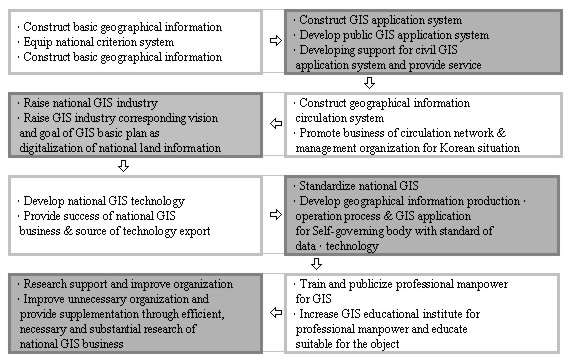 Figure 2. Classified Promotion Plan 4.1 Establishment of National Framework Data baseFramework data is the fundamental data set as a basic and reference map to which specific information can be added for the respective purpose of diverse GIS application areas. As a first step of establishing national framework data base, National Geography Institute (NGI) with local governments focused on the digitalizing of the national base maps, which is scales 1:1,000, 1:5,000, 1:25,000, since 1995. The digitalization of base map completed by the end of 2000.