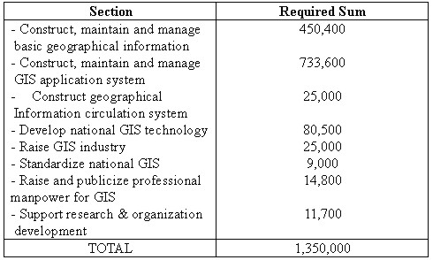 Geographic information production The National Geography Institute (NGI) played a key role in defining the standards in geographic information production. A total of ten of standards were established in this area (including national base map, underground utility map and thematic map). Geographic information distribution/application Two standards were established in this area (including a temporary metadata standard and a data exchange standard (SDTS)). These standards aimed at exchanging and searching the geographic data produced by many different organizations and agencies. For the second stage of the NGIS plan starting in 2001, the strategy and plan on national standards are being arranged to cope with recent technology development, as well as to meet the wide range of customers' requirements. 4.5 Technology DevelopmentFor the development of GIS technologies, approximately US$22.75 million was allocated during the first 5 year master plan. Technology development has been in made for area; i) GIS system integration technology, ii) Mapping, iii) DB tool; iv) GIS application software. 4.6 Human Resource DevelopmentHuman resource development issues are also indispensable element to realize the objectives and goals of NGIS. The NGIS committee is going to increase professional manpower who are involved in NGIS activities, both in government and business. GIS professional manpower training for has been done mainly in university, government run training institute and business institute. As a part of increasing professional manpower training, the NGIS committee is also considering to develop virtual GIS training center which provides cyber-training course through internet. 4.7 Computation of Investment ScaleShare the investment source for the public and civil partnership and induce investment to the civil section. Procurement plan for financial resources such as total investment scale, sectional investment scale and share with civil section will be promoted after consultation with connected section such as the Ministry of Planning and Budget. Table 1. Estimated Investment (Unit : Million WON)