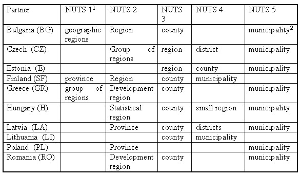 The hierarchy of administrative units varies from country to country. However the international character of the future service requires some possibility for comparable handling. The NUTS (Nomenclature of Units for Territorial Statistics) system of EUROSTAT created for similar purpose is quite suitable. In the following table we give the summary on the administrative hierarchy of the participating countries of the project as compared to the NUTS: