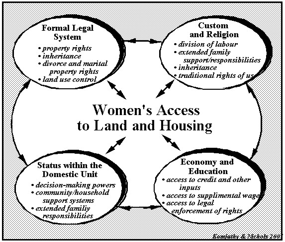 Figure 1. Institutions that Affect Women's Access to Land and Housing Rights 3. WHY IS GENDER AN ISSUE IN LAND REFORM AND LAND ADMINISTRATION REFORM?The body of evidence stressing that outcomes of land reform and land administration programmes and projects have different implications for men and women has grown significantly in recent years (e.g. Zwarteveen [1997], Lastarria-Cornhiel [1997], Agarwal [1995], Habitat [1999]). Traditionally, the involvement of men in such programs was viewed as sufficient and it was assumed that women and children would equally enjoy the benefits of the projects as dependents. As poverty and landlessness continues to expand and "feminization" of poverty becomes more apparent, development organizations and practitioners have had to seek a new direction to tackle these problems. Furthermore, as social, political and economical changes continue to undermine women's ability to secure adequate housing, fulfill the food requirement of the household and use land in a sustainable manner, development projects have begun observing women's priorities and concerns as separate issues. Still, protecting and strengthening women's access to land and its benefits are not without adversities. The following example is a case in this point [for further examples see Nichols et al., 1999]: Documenting Customary Tenure: In several African countries (e.g., Zimbabwe, Uganda, Malawi) there have been recent discussions and proposals to document or register customary rights in land as part of the development of national land policies. The arguments for these certificates of customary tenure and for registration are that the processes will: