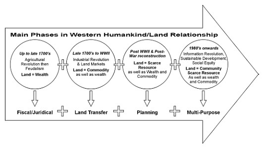to land relationship A review of the dynamic humankind-land relationship (Ting and Williamson, 1999) shows that in a Western context, it may be classified into four broad phases as shown in Figure 2. This figure also shows the cadastral response to this changing relationship. In simple terms the cadastral response in feudal times was primarily fiscal. A legal requirement was added to accommodate the growth of land markets and then a planning requirement was added as private land became scarce after World War II. Today land is seen as a scarce community resource with environmental and social considerations tempering the historic economic driver. As a result, cadastres are assuming a more multi-purpose role with the multi-purpose cadastre vision of the mid-1970s (NRC, 1983) starting to become a reality. As a result of the increasing interest in cadastral systems, a number of statements, guidelines and declarations have been developed which assist in explaining the cadastral concept and which highlight its evolving nature (discussed later).