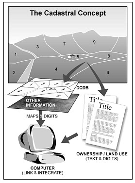 humankind to land relationships THE IMPACT OF THE EVOLUTION OF LAND TENURESA shown in Figure 3, the traditional view of a cadastre is the recording of information about each individual parcel. Many cadastral systems emphasise the recording of "simple" private ownership rights with many systems still not recording public rights in the title register However a cadastral system can record a wide range of complex rights, restrictions and responsibilities in land (UN-FIG, 1996). They can record partial rights and multiple rights. However it is only in the last 20-30 years that cadastral systems started to become more sophisticated in accommodating a wider variety of rights. A useful introduction to land tenure in developing countries is found in the book titled "Land Tenure in Development Cooperation - Guiding Principles" produced by GTZ (1998). For example the need to record strata or condominium rights (apartments) and associated common property in the cadastre is a relatively recent development in most western countries. Interestingly these new tenure relationships have much in common with the rights in a traditional African village compared with classic individual private rights in the Western sense. For example Strata Titles and Community Titles legislation in Australia uses approximate boundaries for individual parcels, individual owners have shares in the common property, and the individual owners comprise a Body Corporate and elect a Chairperson ("Chief") to manage the whole "village" and particularly the common property. If for example an owner wishes to grow some vegetables on the Common Property, the Body Corporate (or "Chief") can allocate some land and the person can grow the vegetables and own the results of their endeavors. When they have finished with the land it automatically returns to the Body Corporate. It is not uncommon for 50% or more of the population of a European country to live in apartments in this manner (although many rent, not own their apartment). There are many variations on this theme in western countries which are usually not highlighted in the cadastral literature. For example almost every modern Western country has "trailer parks" on the outskirts of their major cities. The trailers are usually owned by the occupiers however they do not own the land although many pay local taxes. They do however have some form of tenure with the result it is difficult for them to be evicted in most countries without due process. These trailer parks could be considered the "slums" of the developed world since there are many analogies with the developing world. This analogy is important to encourage flexibility in recording rights in land. This is particularly the case in the documentation of informal, illegal, slum or squatter settlements in developing countries. This flexibility is also important when recording indigenous rights in the cadastre. In many cases indigenous peoples do not share the same cartographic knowledge as their western counterparts and as such different approaches are required when recording their rights, restrictions and responsibilities (including the difficult consideration of their sacred sites). The reality is that in all countries there is a range of tenures that can and should be recorded in a cadastre, if and where appropriate. If the fundamental needs resulting from of the relationship of humankind to land are addressed (primarily access to land and security of tenure) in the cadastre as a first priority, a more flexible approach to recording boundaries is also easily accepted. For example the use of Qualified titles and boundaries "limited as to survey" are useful low cost approaches for establishing a cadastre. In many cases a property can simply be identified by its street address (without survey) on a very approximate index plan as long as its boundaries are well defined by occupations. The Malaysian system is an excellent example of the use of Qualified Titles which are issued for all intents and purposes without survey. THE EVOLVING CADASTRAL CONCEPTWhile there has been a considerable amount of documentation on or reference to cadastres for much of the 20th Century, especially in Europe, there continues to be considerable debate as to what constitutes a "cadastre". To some degree what constitutes a "cadastre" is in the eyes of the beholder. To attempt to clarify the concept the International Federation of Surveyors established a working group in 1992 to develop a "Statement on the Cadastre" (FIG, 1995). The statement defined a cadastre as " a parcel based and up-to-date land information system containing a record of interests in land (e.g. rights, restrictions and responsibilities). It usually includes a geometric description of land parcels linked to other records describing the nature of the interests, and ownership or control of those interests, and often the value of the parcel and its improvements." The FIG cadastral concept is shown diagrammatically in Figure 3.