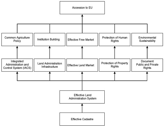 Figure 5 shows a framework explaining the role cadastres play in the accession of Central European Countries to the European Union. Importantly the framework links the establishment and maintenance of a Common Agricultural Policy, institution building, the establishment of a free market, the protection of human rights and the support of environmental sustainability to the cadastre.
