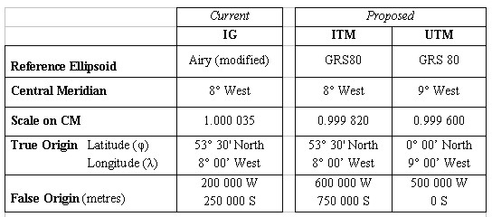 Table 1: Map Projection Parameters Irish Grid (IG)Originated as a classically derived Transverse Mercator projection, the IG was defined to meet the above criteria. The 1975 mapping adjustment resulted in alteration of the scale factor on the central meridian to 1.000035. The parameters associated with IG are unsuitable for a proposed GPS mapping projection associated with the ETRS89 and the GRS80 ellipsoid. Applying these parameters, the difference between the projected ETRS89 and Irish Grid coordinate of a point is in the order of 55 metres. It is anticipated that this will introduce confusion regarding the coordinate system and projection used to derive any given point. Moreover, because of the adjusted scale factor on the central meridian, the effects of mapping distortions are not minimised. UTMUTM is an internationally recognised and widely available standard projection in mapping and GIS software. It divides the earth into sixty zones, between latitudes 84º North and 80º South. Each zone is 6º wide, with a scale factor of 0.9996 applied on the central meridian (Snyder 1987). Ireland is situated in UTM Zone 29, which has a central meridian 9º West of Greenwich, resulting in a small part of Counties Antrim and Down in the east of Northern Ireland extending outside the nominal zone width boundary of 6º West of Greenwich. However, the zone width may be altered to meet local circumstances and since the UTM grid has a standard zone overlap of 40 km on either side of a zone boundary, all of Ireland can be contained within Zone 29. Since the central meridian lies along the West Coast of Ireland, mapping distortions are not distributed evenly. In addition, applying UTM to Ireland results in coordinates that have a 7-digit northing and 6-digit easting, compared to the current IG reference system, which has 6 digits in each. ITMITM is a newly derived projection that may be associated with ETRS89 and the GRS80 ellipsoid. The true origin and central meridian defined in the Irish Grid are maintained, thus distributing the distortions due to the projection evenly. Consideration was given to the introduction of a scale factor of unity on the central meridian. However, using a scale of 0.99982 (see Appendix A) results in two standard parallels, and the magnitude and effects of scale change are minimised. The position of the false origin is moved to a point 600,000m west and 750,000m south of the true origin. This results in grid coordinates that are significantly different from IG, but does not introduce additional distortion or complexity. The magnitude of the shift ensures that IG coordinates plotted on the ITM projection do not fall on Ireland or Northern Ireland, and vice versa (see Figure 1).