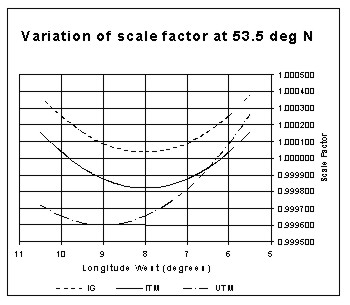 Figure 2: Variation of scale factor at 53° 30' N AreaCurrently all areas are computed by OSi and OSNI directly from the mapping (IG on the Airy modified ellipsoid), without applying scale corrections. Since all survey observations are reduced to the reference ellipsoid before being projected onto the mapping, changing the ellipsoid will introduce changes in the areas shown on maps. To quantify the magnitude of the change, an area of one hectare (100m x 100m) on the current mapping was re-projected onto UTM and ITM. Applied to UTM, the largest change in area occurs on the central meridian at 9° West of Greenwich, and results in a decrease in area of 10.3m2 (0.1%). Similarly, the worst-case for the proposed ITM mapping system occurs on the ITM central meridian at 8° West of Greenwich, and results in a decrease in area of 1.7m2. Using the current IG projection parameters applied to the GRS80 ellipsoid results in an area increase of 2.4m2. When using a 1:1,000 scale map it is only possible to plot to an accuracy of 20cm, which results in a possible error in the area measurement of ±40 m2. This is significantly greater then the area change resulting from a change in projection and therefore the effect on area measurements can be considered negligible. ConvergenceIG and ITM both use the same true origin and central meridian, and therefore using ITM projection parameters does not affect convergence. Furthermore, the change in the size of the ellipsoid from the modified Airy to GRS80 is not large enough to affect the calculated convergence. Adopting UTM implies a central meridian at 9° West, which results in an increase in convergence of between 47' and 50'. At the extremes of the projection this increases convergence from 2° 03' 39" to 2° 53' 08". 6. IMPLICATIONS AND PROPOSALSAs described in previous sections, any new projections should minimise distortions within the new mapping system and realise ETRS89 coordinates that are substantially different from the existing corresponding Irish Grid coordinates (thus avoiding confusion). These criteria immediately rule out the possibility of maintaining the current projection parameters. However, both ITM and UTM will provide coordinates that are significantly different to IG. With regard to scale correction, UTM produces the largest scale correction, of -400ppm or 40cm per km on the central meridian. This becomes significant when plotting measurements of greater than 500m. UTM also provides the largest range of correction (659 ppm). The location of the standard parallel requires that corrections of greater than 200ppm are applied to all observations west of a longitude of 7º west. ITM, however, minimises and evenly distributes scale corrections, with a maximum scale correction of 180ppm on both the central meridian and the extremes of the projection. Positioning the central meridian in the centre of Ireland at 8º west also results in even distribution of convergence and t-T corrections. The location of the UTM central meridian produces increases of 50' in the convergence calculated along the East Coast. The adoption of either UTM or ITM map projections has no significant effect on area measurements. This paper has described the complexities introduced when attempting to make GPS measurements fit onto existing mapping. The growing numbers of GPS users, most of whom have no interest in issues such as transformations and adjustments, will therefore be best served by a mapping system which is fully compatible with GPS. There are, however, very many existing users of OSi and OSNI mapping. Many of these have associated their own data with the mapping data and therefore have significant databases using IG coordinates. There is substantial effort involved in converting these large databases into a different coordinate reference system. Adoption of new projections may also have subsequent effects on users' map cataloguing systems. Any proposed change cannot ignore the needs of these users. Whilst recognising that the majority of map data users in Ireland will not be concerned about the international compatibility of their work, there are important applications which will benefit significantly from such compatibility. Although UTM, for the reasons described, is not the ideal map projection when considering Ireland in isolation, it is an internationally recognised standard, and is likely to be adopted by the European Commission for its mapping needs. Consequently, OSi and OSNI intend to adopt the following policy: