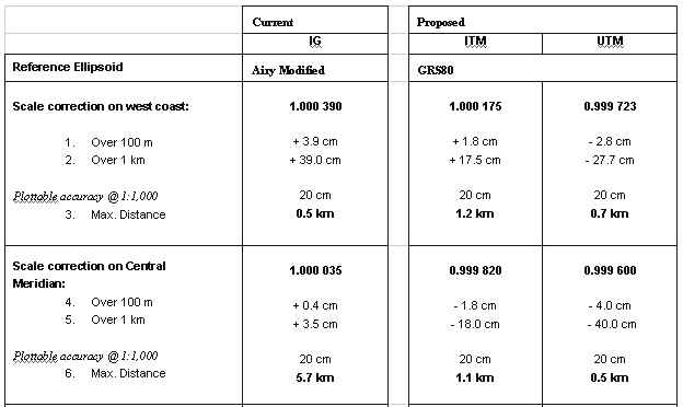 7. FURTHER WORKConsultations with the main user groups on the proposals above are currently underway, having begun with an introductory leaflet in December 2000 and continued with a technical consultation paper in February 2001. Seminars will be held around Ireland in April 2001 and decisions on a number of issues will be announced in May 2001. Wide consultation and education is seen as vital in this very significant change. Particular areas for consultation include the timescale within which users can accommodate changes, the coordinate reference system to be used for small-scale maps, and how product design can be used to assist in the easy identification of the projection being used for any particular map. OSi has converted its data collection and storage processes to use ITM as its internal coordinate system, thus preserving the accuracy of GPS work; OSNI has not, at this stage, made this change and is currently considering options. In addition, to support the wider use of GPS in Ireland, OSi and OSNI are also currently in the process of installing active GPS networks which are planned to be in operation by the end of 2001. Use of ETRS89 requires that the GRS80 ellipsoid is used. Since the geoid in Ireland is not coincident with this ellipsoid, appropriate reductions must be applied when carrying out precise surveys. To further improve compatibility of OSi and OSNI products with GPS, therefore, a precise geoid model for Ireland (as part of a wider contract to create a precise model for the British Isles) will also be put in place during 2001. 8. CONCLUSIONSDuring 2001, OSi and OSNI will introduce new mapping projections for Ireland. By using the national control network, along with OSi and OSNI mapping projected in ITM or UTM, GPS surveys can be combined with national mapping while still maintaining survey accuracy and avoiding the current requirement to compute or apply transformations. It is further anticipated that the proposed new map projection, ITM, will simplify and encourage the use of GPS with OSi and OSNI products. Compatibility between the new projection and the existing Irish Grid will be maintained using derived transformations. The new projection options have therefore been designed to cater for existing map users, GPS users, and those users who require direct conformity with international systems. In this way, OSi and OSNI are fulfilling their obligations, as national mapping agencies, to meet the needs of all map and map data users, present and future. REFERENCESMortiz, H., 1980, Geodetic Reference System 1980 (GRS80), Bulletin Geodesique volume 54 OSi, 1996, The Irish Grid, OSi, Dublin OSi/ OSNI, 1999, Making maps compatible with GPS, OSi, Dublin/ OSNI, Belfast Snyder, J.P., 1987, Map Projections - a working manual, USGS paper 1395 APPENDIX A: SCALE FACTOR ON THE CENTRAL MERIDIAN FOR ITMThe longitudinal extent of Ireland is from approximately 5° 25' to 10° 30' west of Greenwich. Minimum distortion will be achieved if the central meridian bisects these, i.e. at 7° 57' 30" west of Greenwich. Obviously, it is desirable to simplify the parameters involved in the projection; therefore, this was rounded to 8° west of Greenwich. To select the scale factor on the central meridian three options are available: