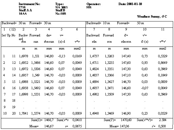 Again all observations on both staffs A and B are made for 10 set-ups: Evaluation of the results Explanations for the calculation and the evaluation of the check are provided in the annexe. The full test procedureThis field method is proposed for the determination of the highest achievable precision using one specific type of equipment. Normally it is for precise levelling (linear applications) where high accuracy is demanded and the set-up observations are made with equal lengths backwards and forwards. The accuracy will be expressed in terms of the standard deviation of 1km double-run levelling. For its implementation we have to establish a test line AB of about 60m in a plane area with homogenous ground surface (gravel preferably) free from vegetation or other disturbing factors (water plane, grass). A and B have to be stable during the whole operations. The chosen site length will be 30m, which is the recommended distance for precise levelling in many countries. Note: