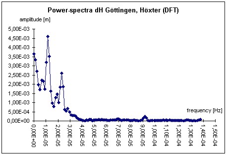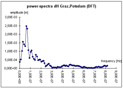 Figure 9: Power-spectra (Göttingen-Höxter, height-component) The BKG-data consists of baselines with lengths of continental dimensions; for presentation the height component of the 600-km-baseline Graz (Austria) - Potsdam (Germany) is chosen. The surprising result is a maximum peak at 27.3 weeks, and not at the expected 52 weeks. The peak stands for a semi-annual period, because the uncertainty of the peak again includes the theoretical semi-annual value of 26. In any case the result is a surprising one due to the expectation of an annual period. The annual period was expected because of e.g. tropospheric mismodelling. The cause for this rather unexpected correlative behaviour is supposed to be the ionosphere. In general some of the ionospheric layers show a semi-annual periodic behaviour (e.g. BAILEY et.al. 2000 and FEICHTINGER et.al. 1997). For modelling purpose (see chapter 2.1) the influence of the ionosphere was set to zero. This had its reason within the baseline lengths of maximum 50 km. WANNINGER (1994) points out that the ionospheric influence may arise up to approximately 0.2 ppm for the second order terms that remain after the GPS-2-frequency correction. For a 600 km baseline this influence has to be taken into account. Other possible semi-diurnal periods are the movement of the geo-centre (MONTAG 1997) or influences of the orbit determination, that should in general be eliminated by the orbit determination technique (TEUNISSEN, KLEUSBERG 1998).