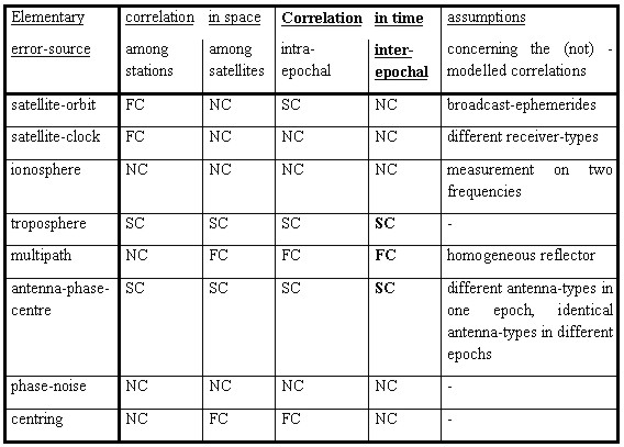 surveys ; One of the most complex measurement techniques are geodetic GPS-measurements. Up to now a complete model for determining uncertainties is not evaluated. SCHWIEGER (1999a) developed a model of elementary errors for GPS monitoring surveys valid up to maximum baseline lengths of 50 km. Table 1 gives a summary of the error sources that have to be taken into account and shows the occurrence of correlations in general. Special attention is given to time-dependent correlations covering years of observations, because the research was focussed on this topic. In any case the occurrence of time-dependant correlations is obvious for short periods as well as for periods covering years of observations.