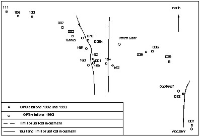 The equation demonstrates, that negative correlations decease and positive correlations increase the uncertainty of differences. Typical GPS-applications are the single, double and triple differences algorithms of GPS evaluation software. As another example the analysis of deformations may serve. In this case differences among co-ordinates of two or even more deformations epochs have to be realized. Table 2 shows interepochal correlations as well as alternations of the uncertainties of height-deformations, both estimated in a synthetic way (SCHWIEGER 1999a). The influence of day time, season and satellite configuration is obvious (compare chapter 2.1). The gain for the standard deviation of the height deformation (baseline 36-39) reaches an amount of almost 70 %, if identical satellite configurations, season and day time are simulated.