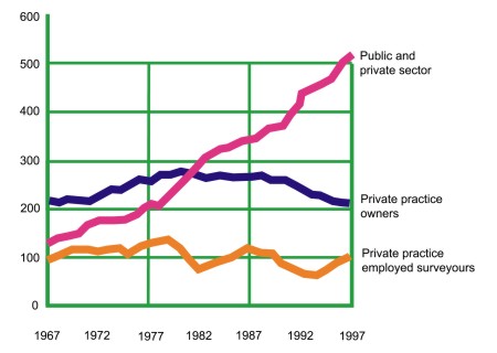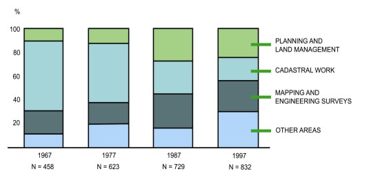 In 1967 the number of surveyors working in the private surveying firms accounted for about two thirds of the total profession while surveyors employed in the public sector or in other private business accounted for only one third. In 1997 the situation is reversed. Two thirds of the profession is employed outside the private surveying firms. During these 30 years the number of active surveyors is doubled from about 450 in 1967 to about 850 in 1997. This means that the growth is located within the surveyors employed in the public sector or other private business while the number of surveyors working in the private surveying firms has been more or less steady during the last 30 years. Over the same period, the professional profile has changed completely. In 1967 and still in1977 the profile of the Danish surveyor was dominated by the cadastral area while in 1997 it accounts for only 20 percent of the total working hours. In 1997 the distribution was as follows: Planning and Land Management 23 %, Cadastral Work 20 %, Mapping and Engineering Surveys 26 %, and "Other Areas" 31%. Next to the decrease in the cadastral area it is remarkable that the biggest area in 1997 is located outside the traditional working areas. These "other task areas" include general management, general IT-development, and other business developments. The evolution of the professional profile in Denmark is shown in the diagram below.